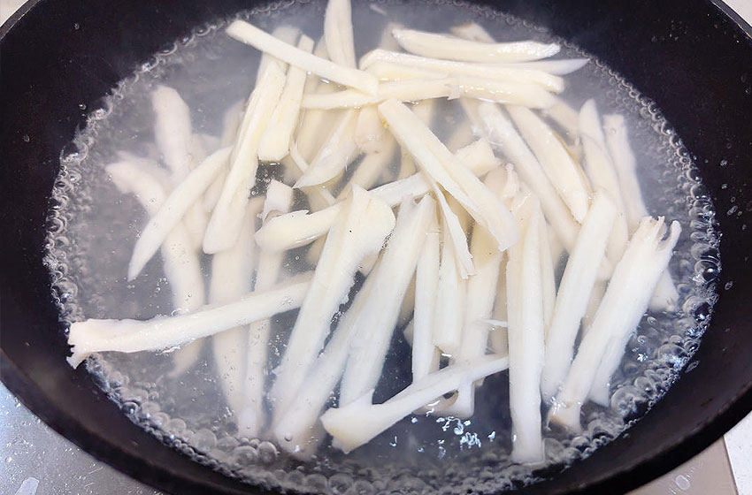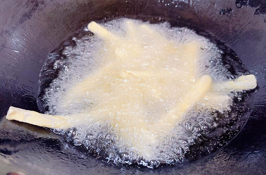 3、油锅温度合适是指放入藕丝能三秒自动飘起来。