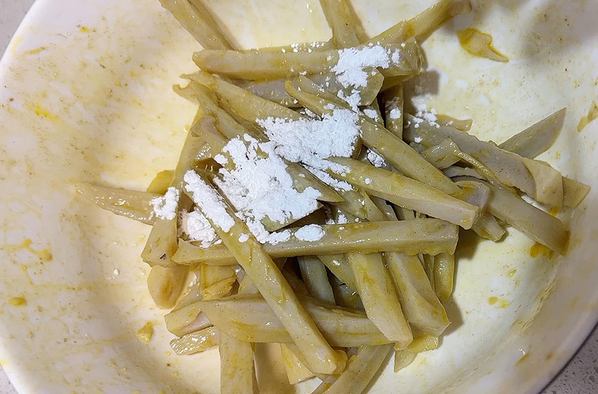 2、裹玉米淀粉很重要,是倒一次玉米淀粉,等完全没干粉后再放下一次,直到藕丝没有粘连。
