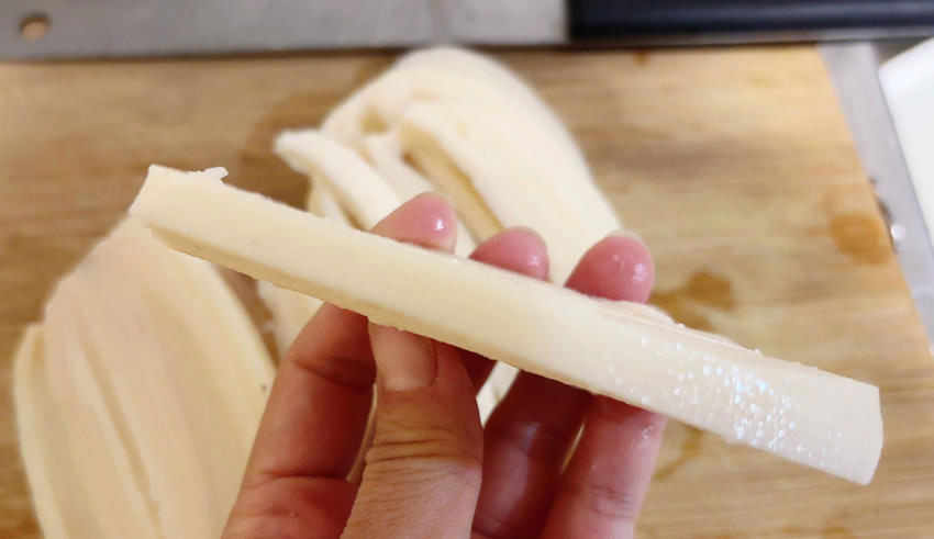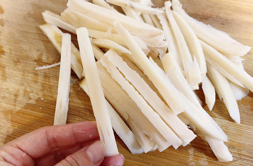 再根据藕的缝隙大小,切成和筷子差不多粗的条状。