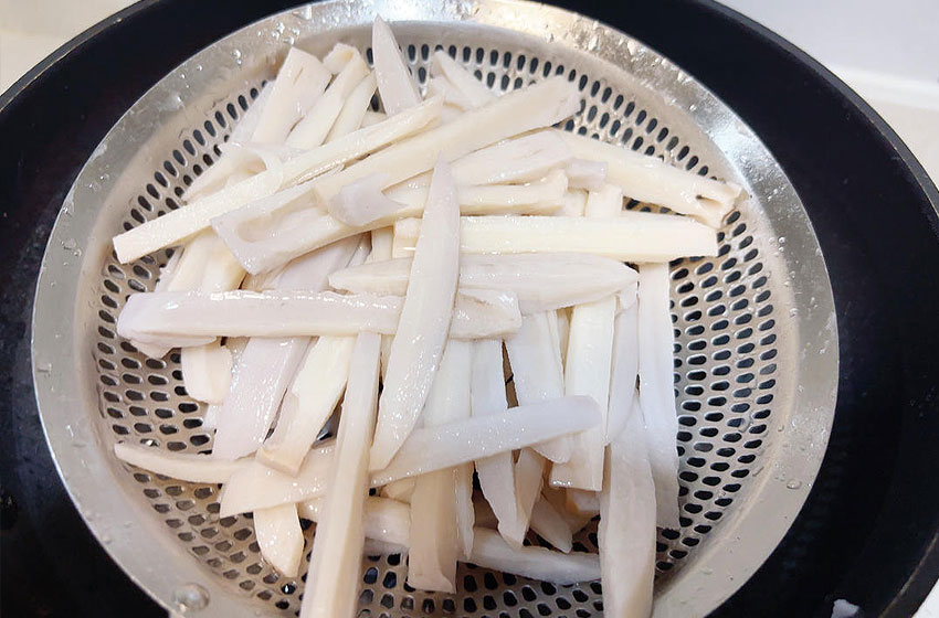 用漏勺沥干水分。这一步如果赶时间,就用厨房纸把多余水分吸干。