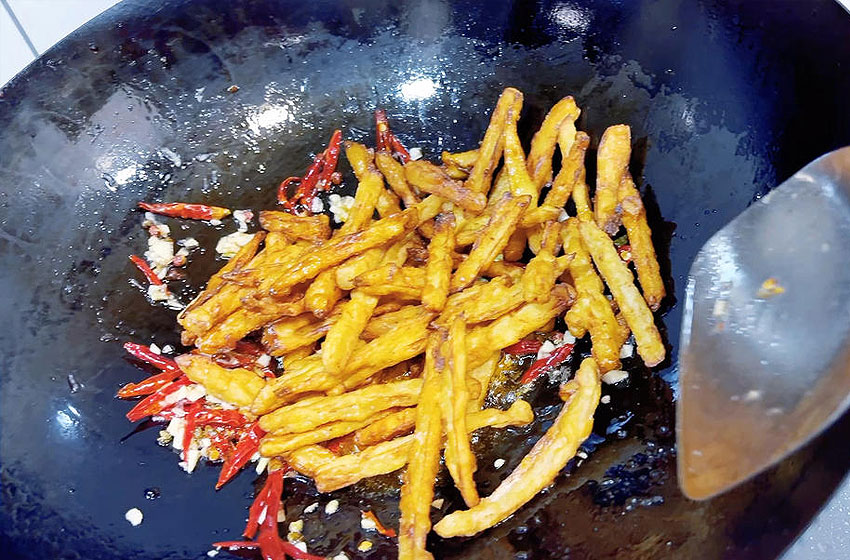 4、炸完藕丝的锅是热的,有余温,所以我们第一次炒干料不用开火。