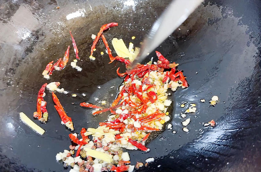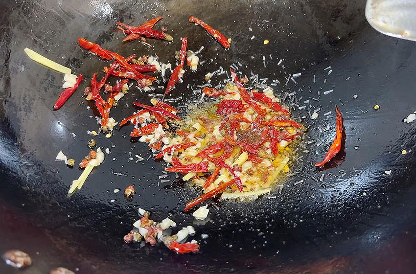 在关火的情况下,下入干辣椒,青红花椒,大蒜,生姜,利用炸油锅之后的余温炒出香味。