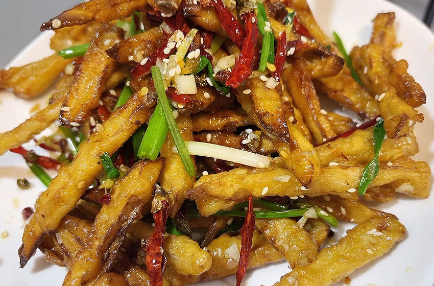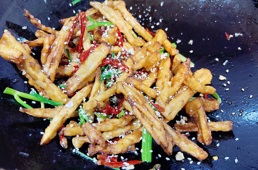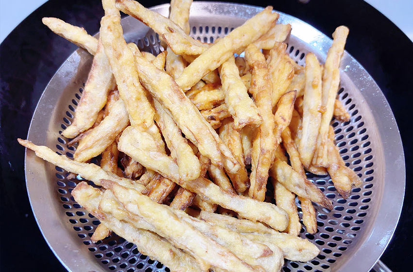 炸好第一遍后,升高油温,将所有藕丝放入油锅中,复炸20秒出锅,沥干油。