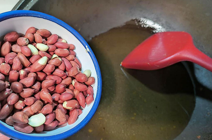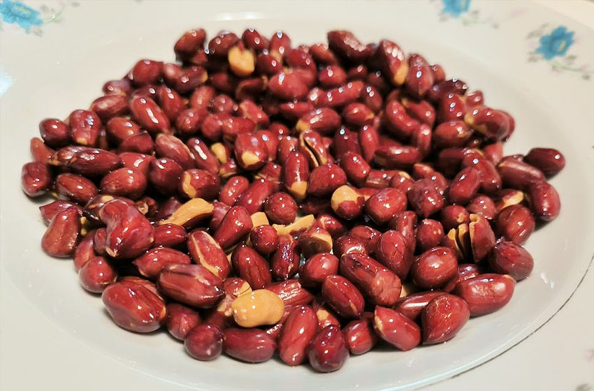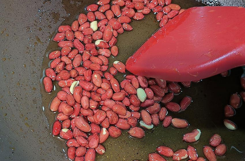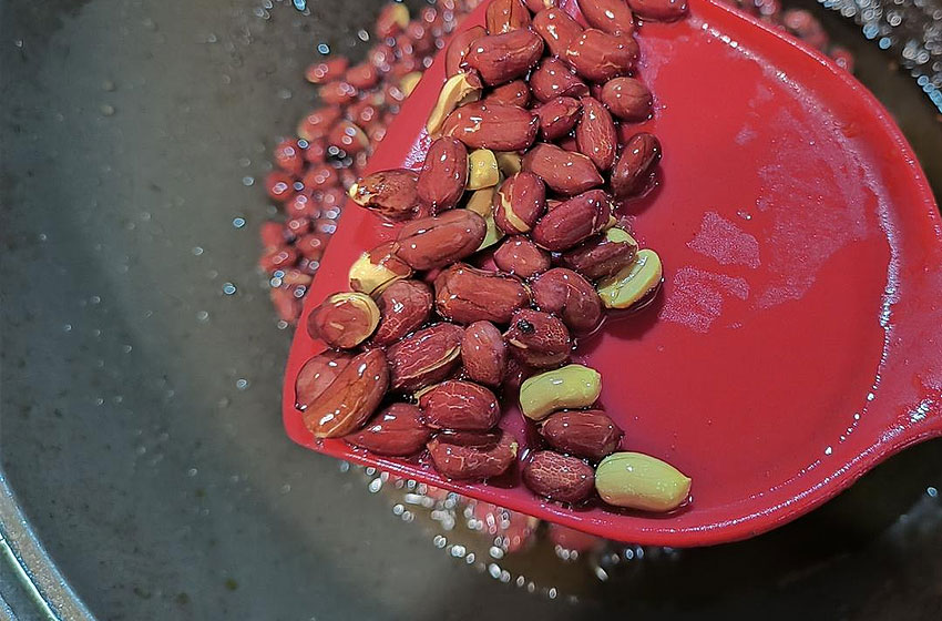 冷锅冷油放入花生,因为是红皮花生取几粒掰开,以便炸制后观察花生颜色判断生熟。