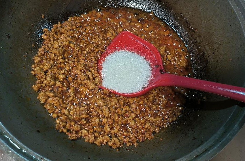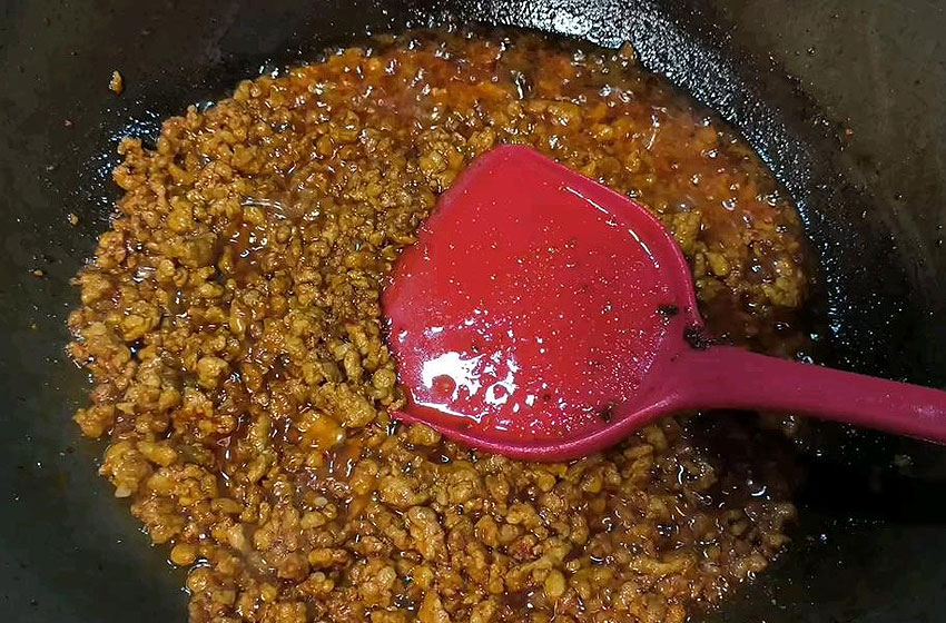 炒至肉馅出油尝咸淡,再酌情决定是否加盐(昭通酱含盐)。