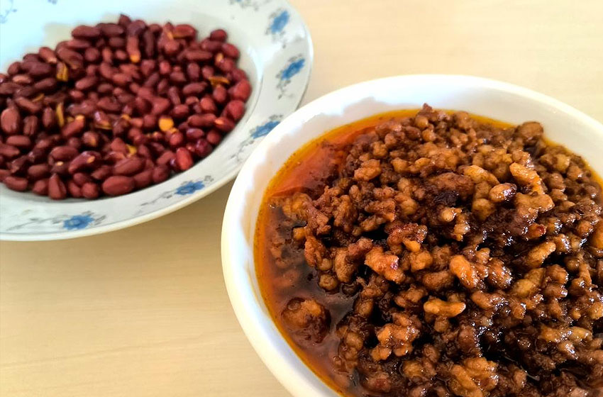 材料:花生80克、猪肉馅300克、昭通酱50克、白糖40克、食用油适量