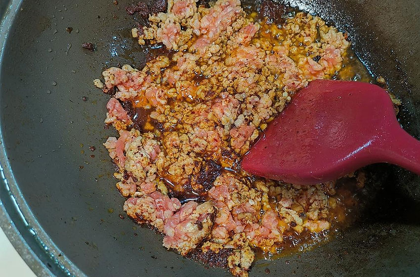 用锅里的余油炒猪肉馅,同步放入昭通酱。