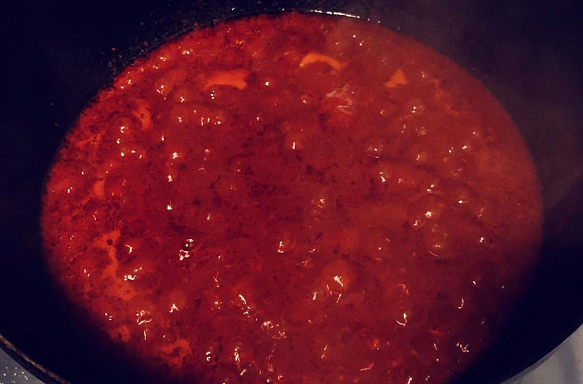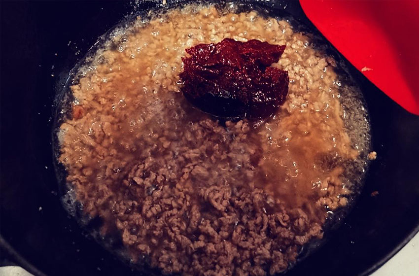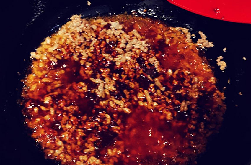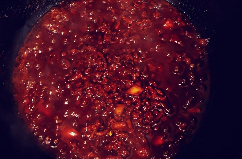 放入蒜瓣,用锅铲顺时针搅拌,注意不要太快,目的是不让肉酱粘锅底。
