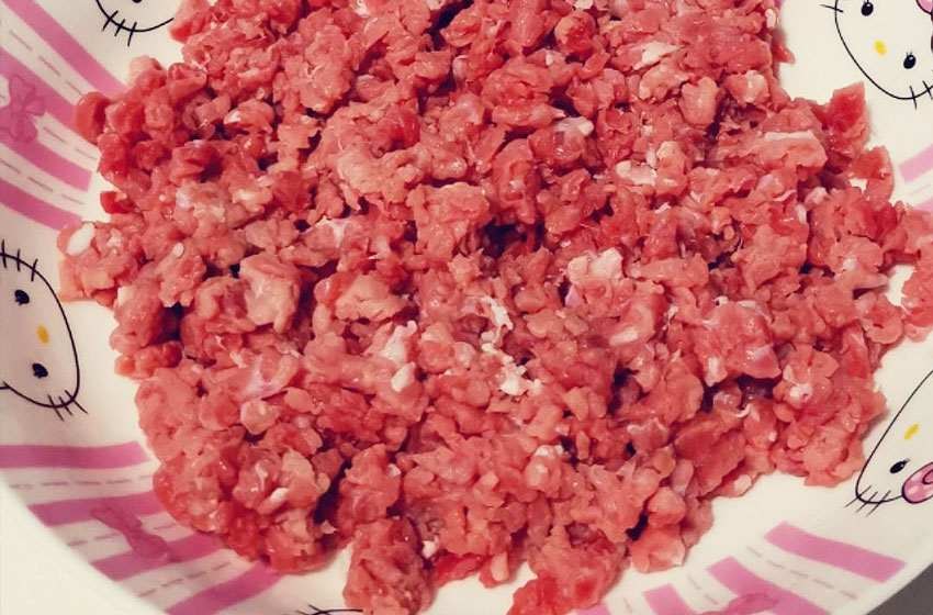 牛肉水中取出,挤掉水分后切成末。这里的牛肉可以换成猪肉。