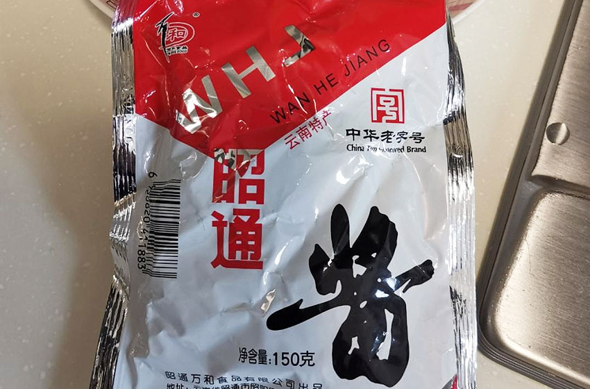 昭通酱剪开备用,这里的包装是150克,配350克肉末,以此类推。