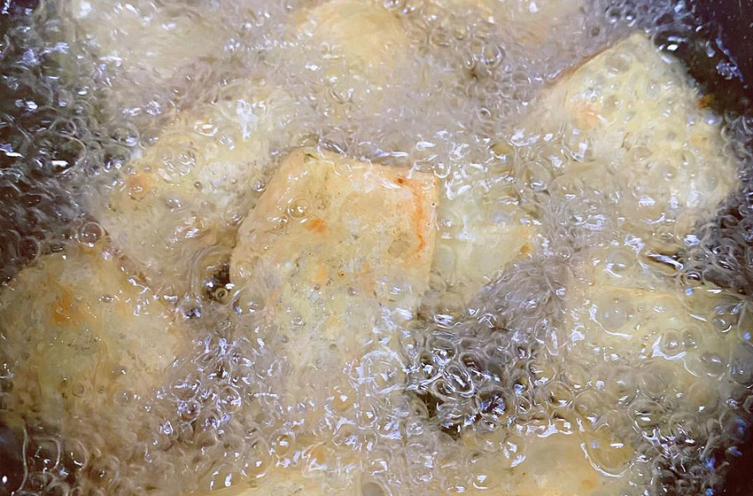 把粿肉卷切段,放入油锅内炸。油温大概7成的时候放入粿肉卷。