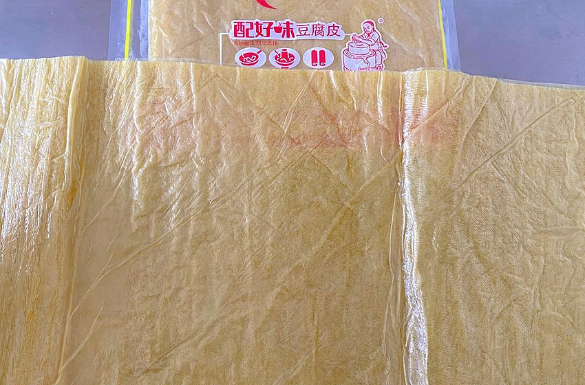然后按照你自己的蒸笼来切割豆腐皮的尺寸。我大概切成a4纸的大小。