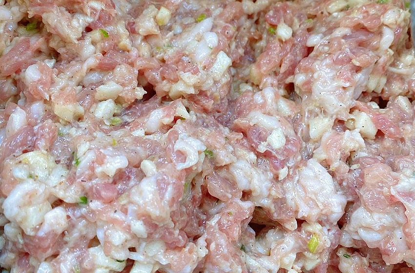 材料:猪肉1500克、马蹄750克、蛋清3个、葱白30克、番薯粉80克、花椒粉10克、五香粉或十三香5克、盐20克、鸡粉5克