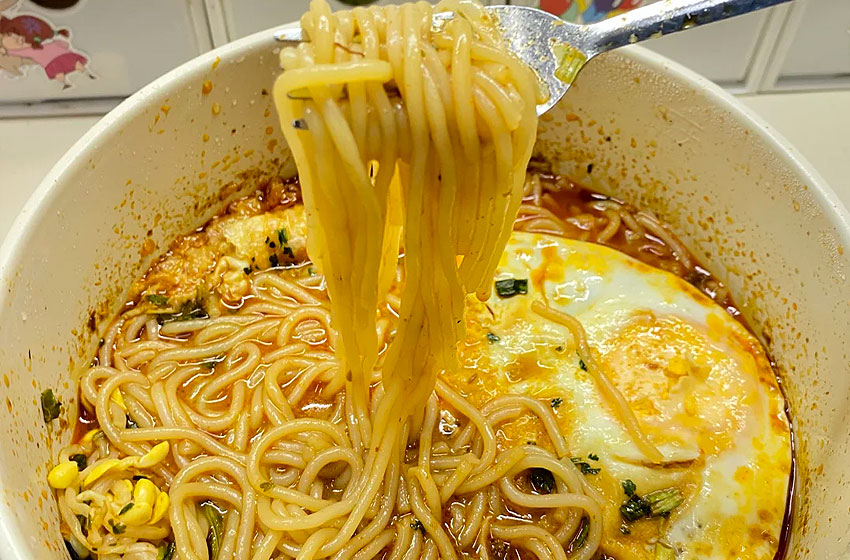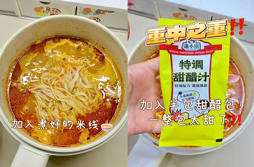 加入煮好的米线,加入甜醋包,一整包太甜了。