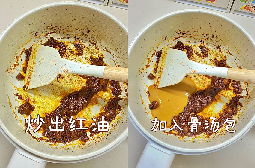 炒出红油,加入骨汤包。