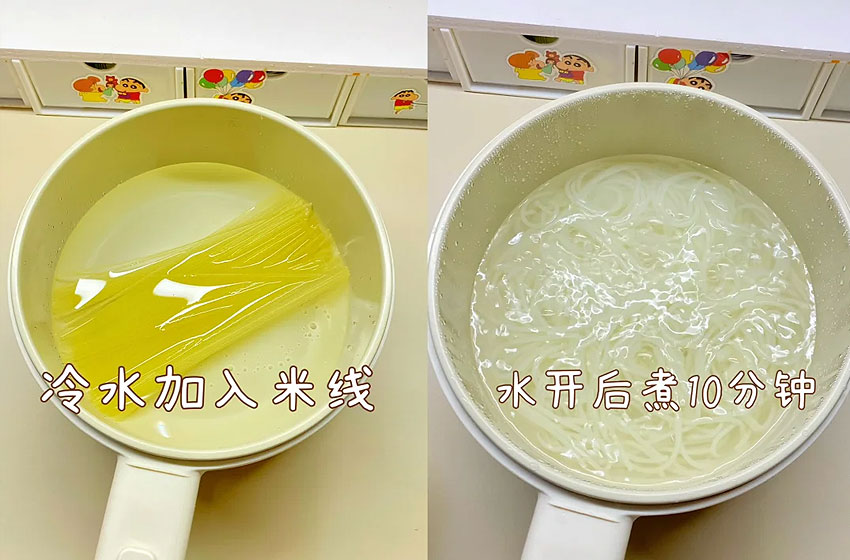 小锅冷水加入米线,水开后煮10分钟。