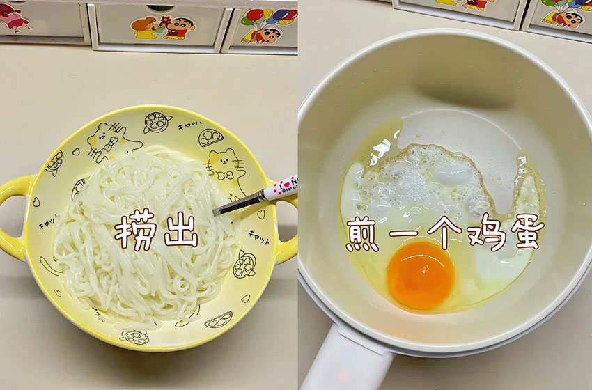 米粉捞出备用;小锅放一点油,煎一个鸡蛋备用。