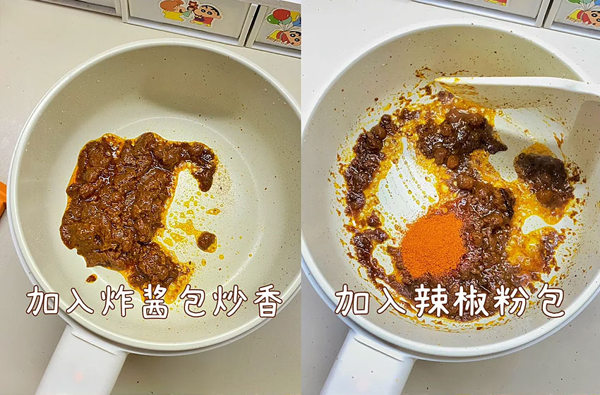 小锅加入炸酱包炒香,加入辣椒粉包,吃不了辣椒的注意辣椒面少放一点。