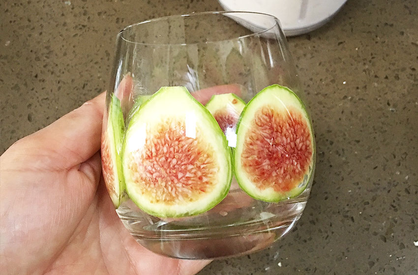另两个带皮无花果切薄片,挑形状漂亮差不多的贴在酸奶杯内壁上,轻轻按压使之贴合。
