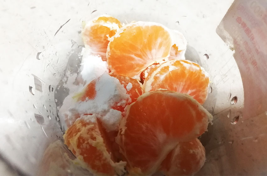 蜜桔果瓣和糖放入榨汁机榨汁。