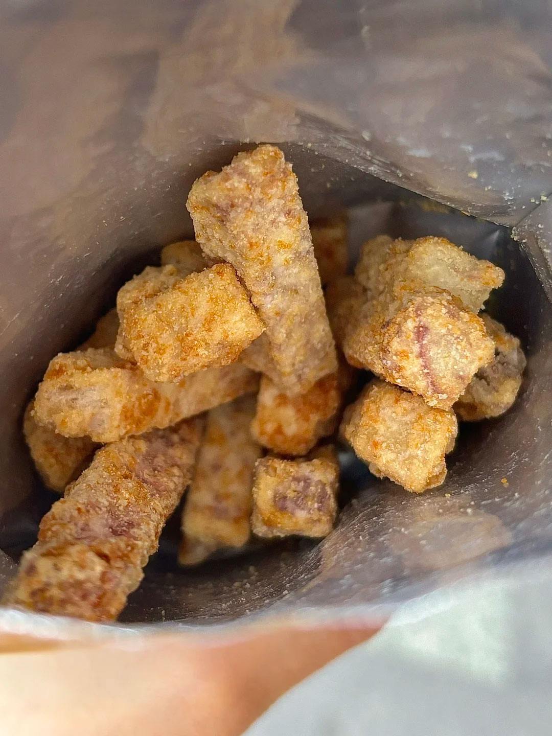 cvt中越泰荔浦芋头条,仅采用广西荔浦核心产区芋头,槟榔花纹明显,淀粉含量≥70%,确保粉糯基底。工艺创新,鲜芋切片后经VF技术脱水,保留紫色纹理与纤维感,无人工色素添加。