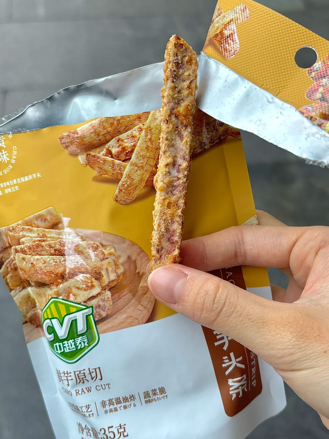 cvt中越泰荔浦芋头条,外观呈淡紫色条状,表面略带细微凹凸,保留天然芋头纤维纹理脆度:硬度适中,咬合发出清脆"咔嚓"声口感:初尝酥脆,咀嚼后芋头特有的粉糯感逐渐释放。